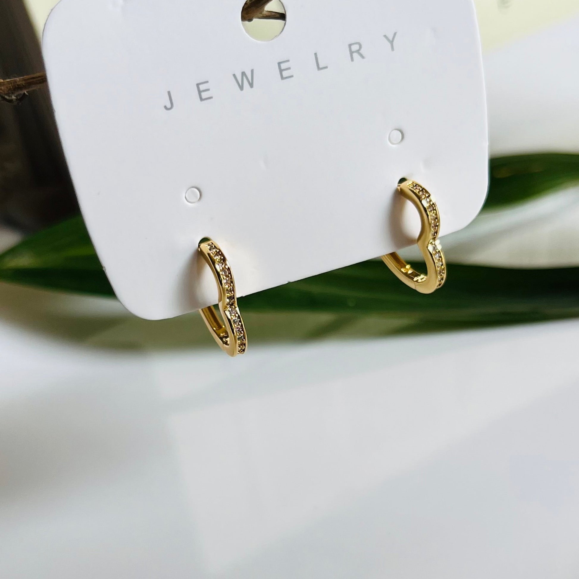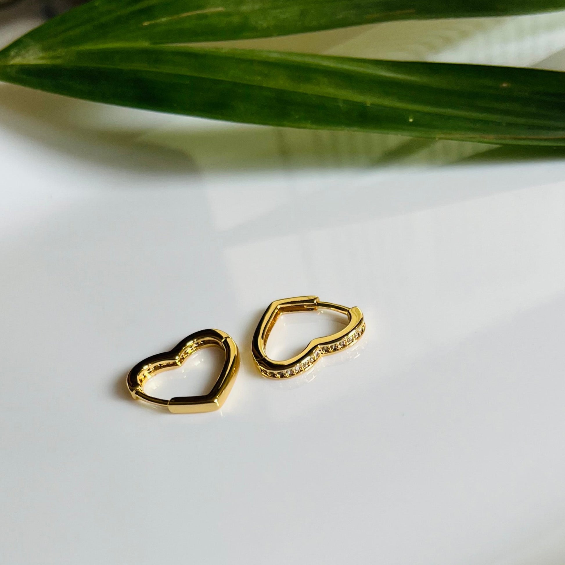 Earrings : Dazzling heart-shaped 18K gold-plated huggie hoop earrings, beautifully designed with a sleek polished finish and delicate cubic zirconia detailing for a romantic and timeless look.