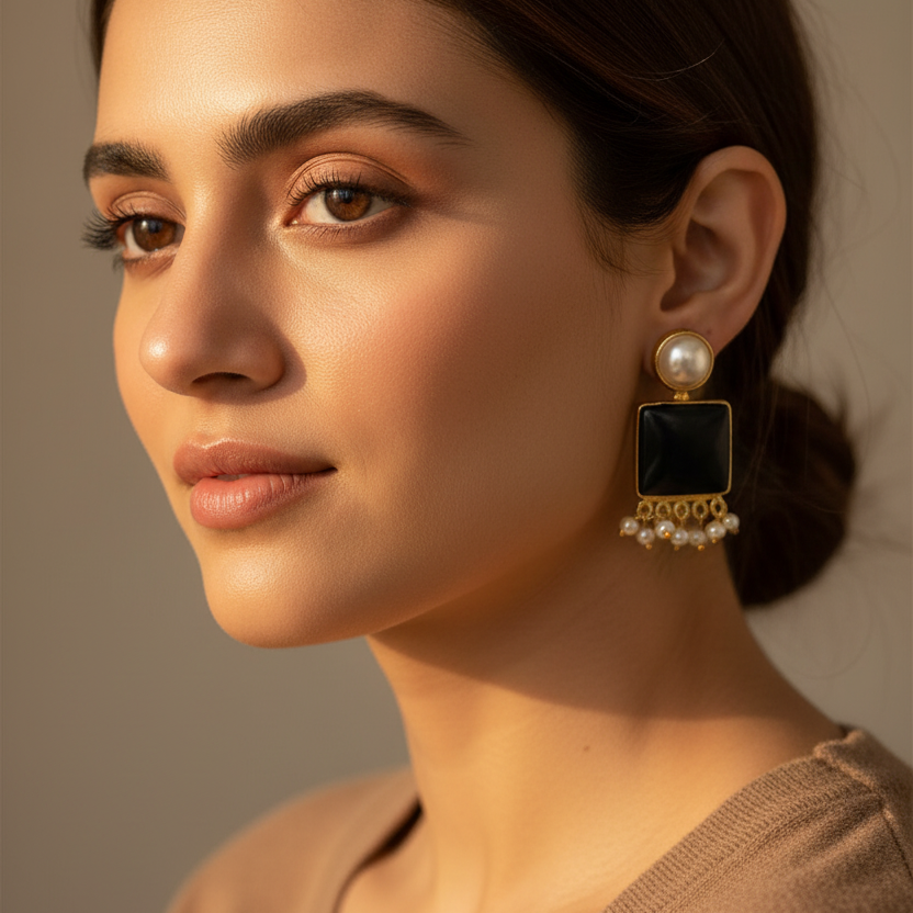 Elegant gold-tone statement earrings featuring a classic pearl stud top paired with a glossy black square stone and delicate pearl drop detailing. The design creates a graceful and sophisticated silhouette, blending traditional charm with modern elegance.