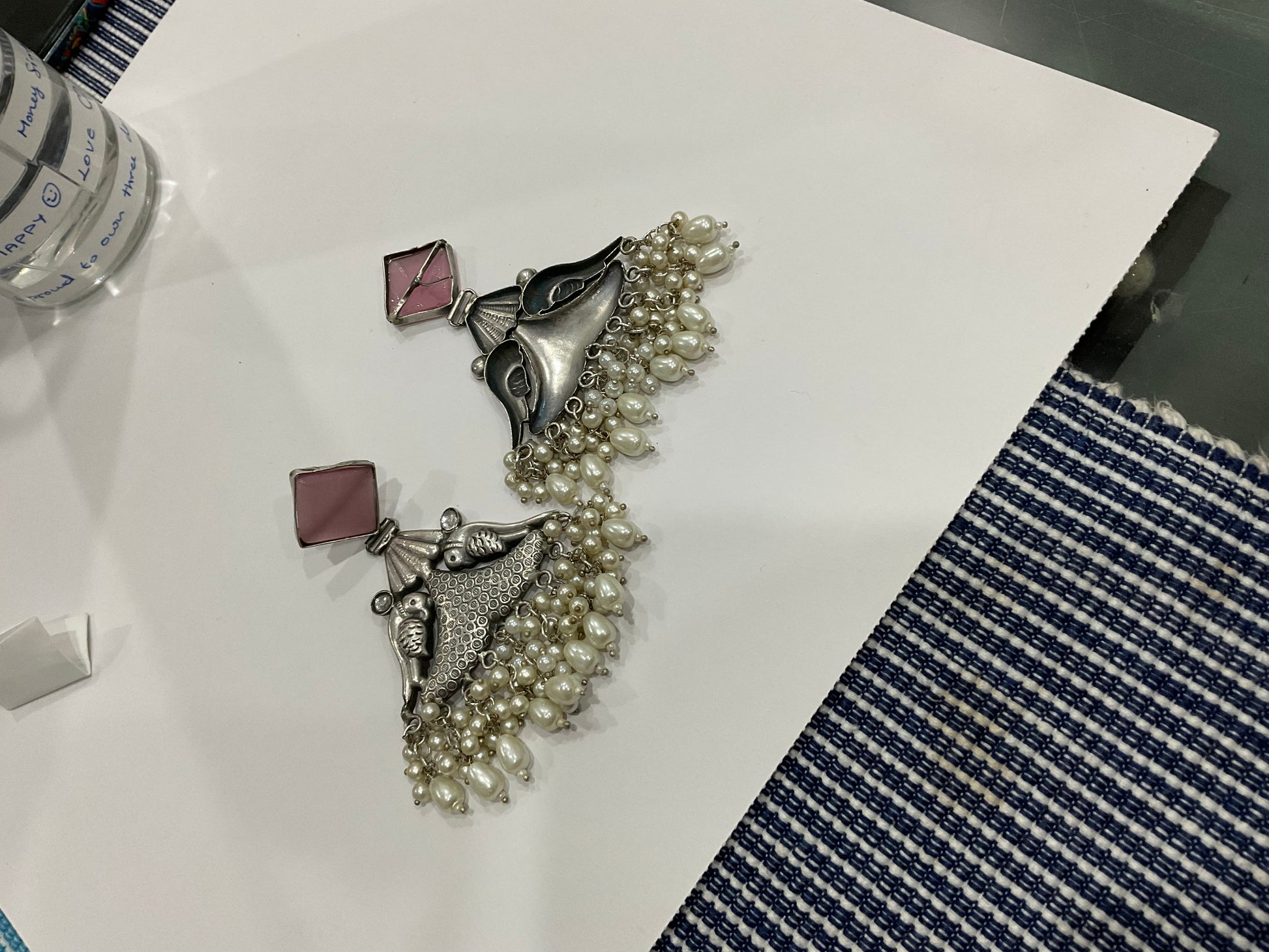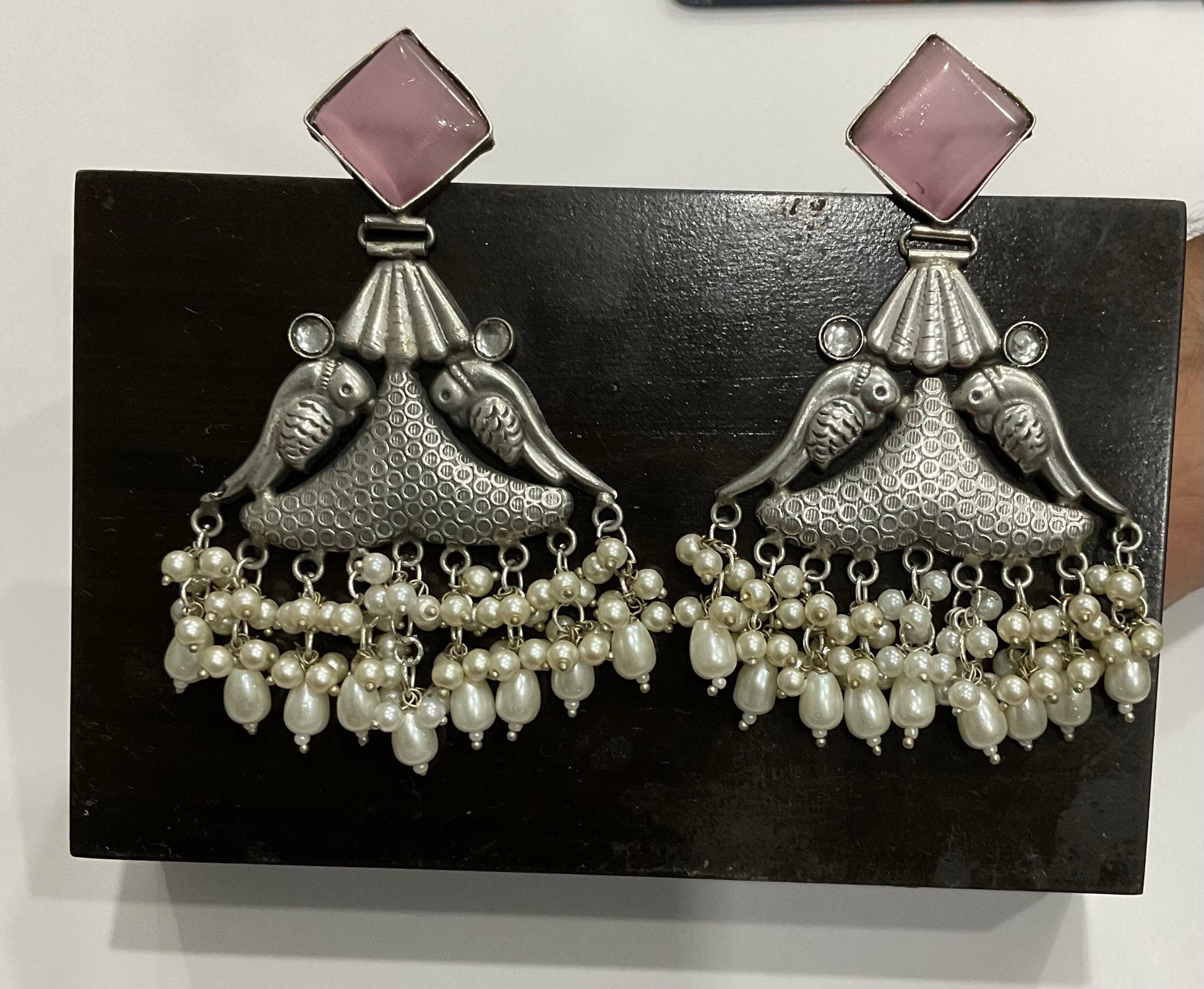 Artfully crafted oxidised silver-tone jhumka earrings featuring a bold geometric pink stone stud at the top, leading to an intricately detailed peacock motif. The sculpted design is enriched with textured metalwork and finished with cascading clusters of delicate faux pearls that add graceful movement and traditional charm. A perfect blend of heritage artistry and contemporary statement appeal, these earrings exude timeless elegance.