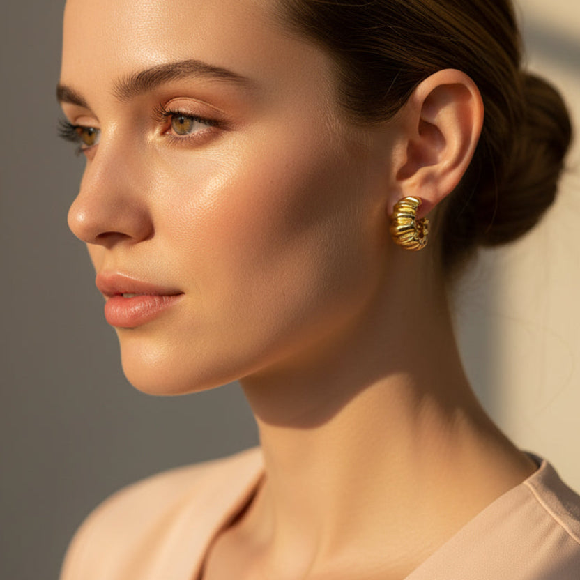 Stylish ribbed gold-tone stud earrings featuring a bold sculpted design with layered grooves and a glossy high-shine finish. These modern statement studs offer a perfect blend of minimalism and contemporary flair, ideal for lovers of textured gold studs and chic everyday statement jewellery.