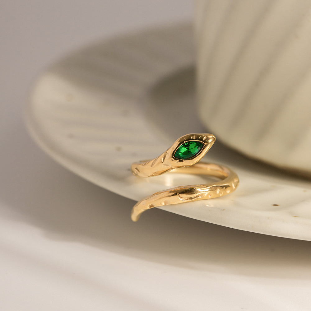 A contemporary open wrap ring crafted in a rich gold-tone finish, featuring an organic sculpted band that gracefully coils around the finger. The design is elevated with a striking marquise-cut crystal set in a sleek bezel frame, adding a subtle sparkle and refined edge. With its fluid silhouette and modern artistry, this ring blends minimal elegance with statement appeal, making it a versatile addition to any jewellery collection.