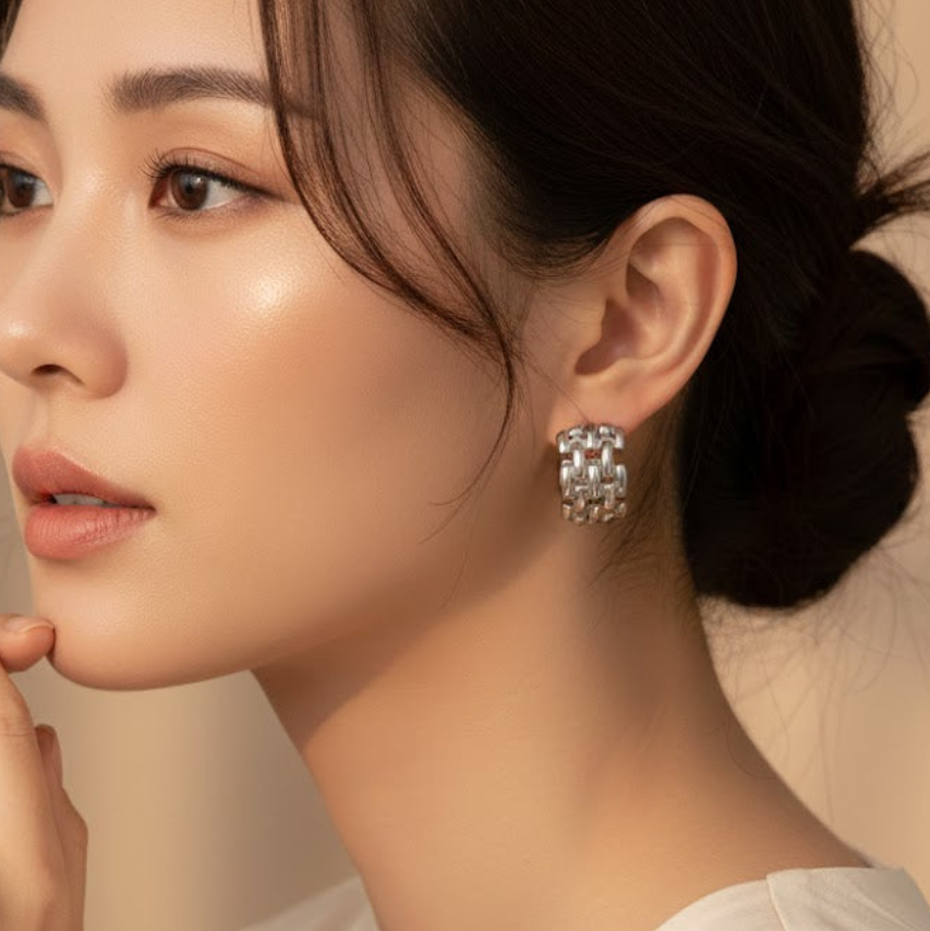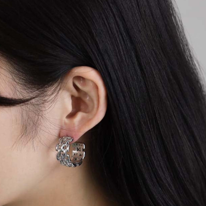 Elegant silver -tone hoop earrings featuring an interlinked chain-inspired design for a bold yet refined look.