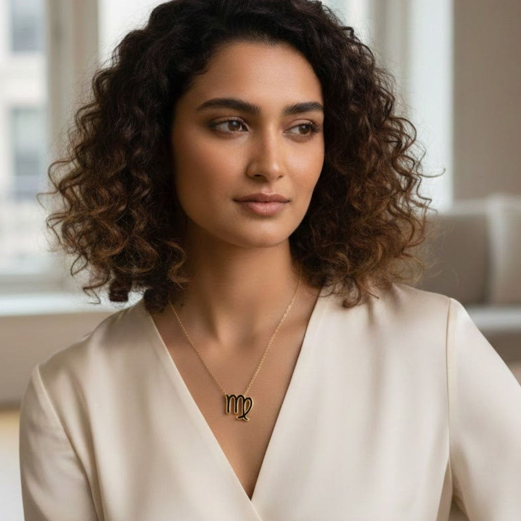 Zodiac-themed gold-tone pendant necklace featuring a sleek Virgo symbol charm on a delicate chain. This minimalist celestial design adds a personalized and stylish touch, perfect for zodiac lovers and dainty everyday jewellery.
