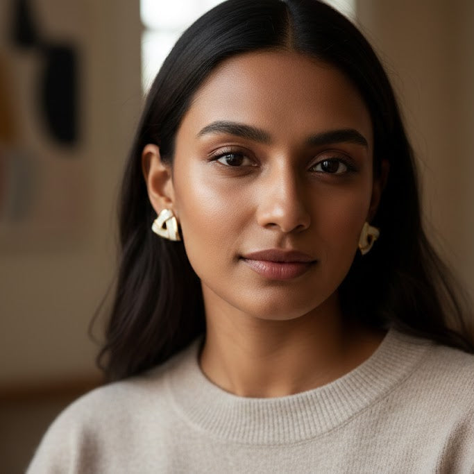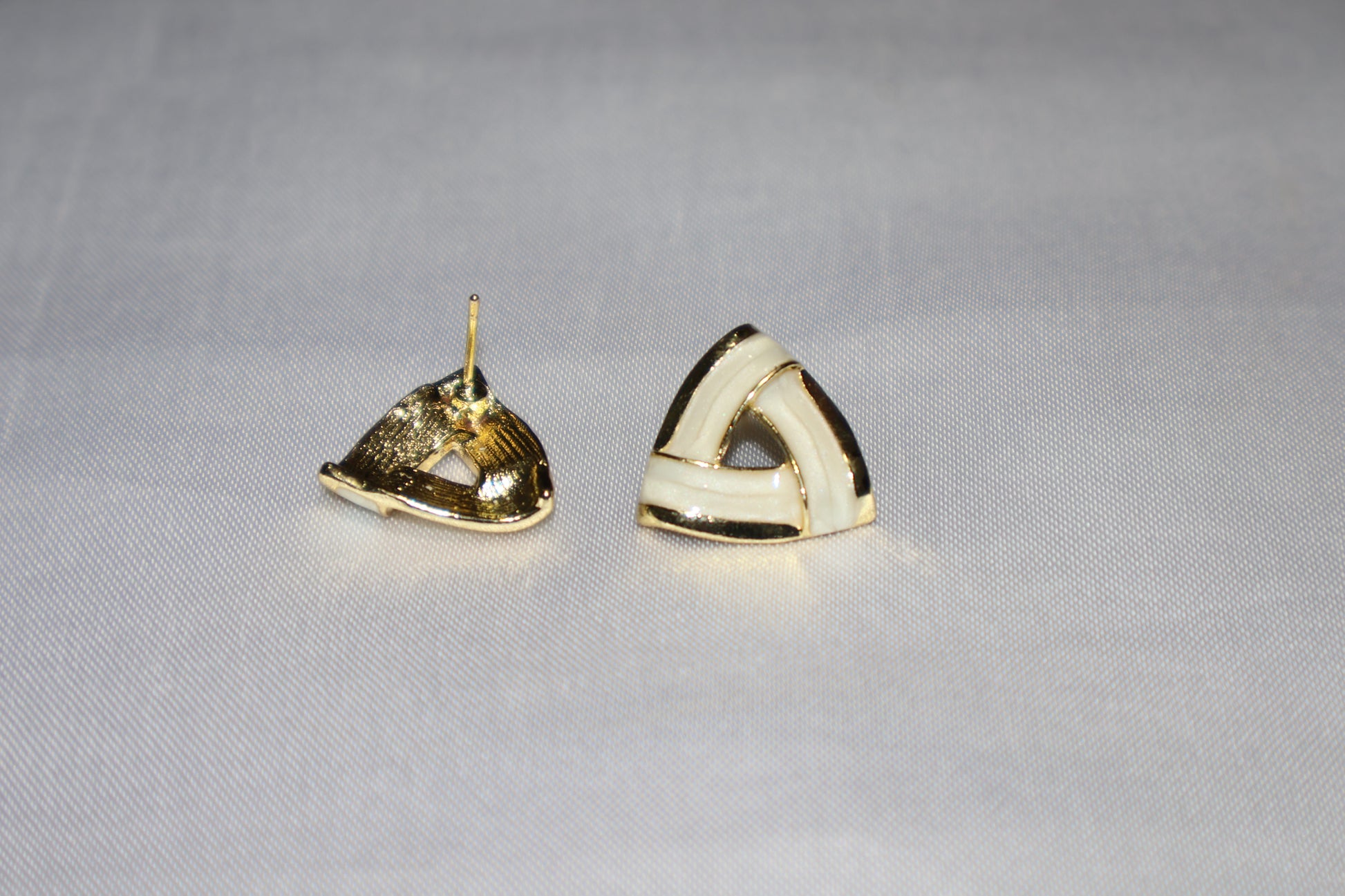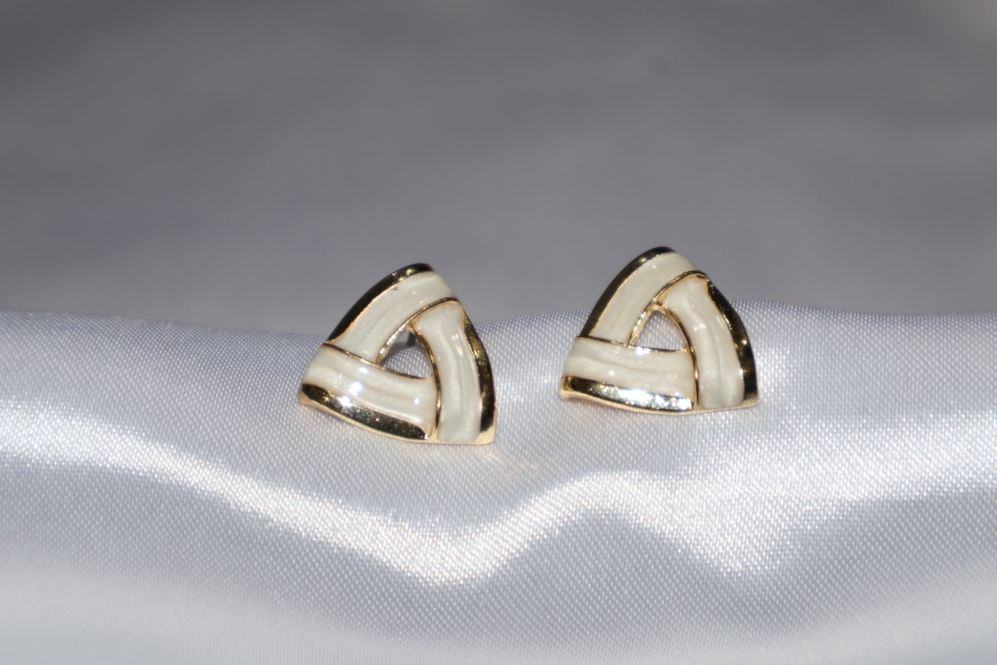 Elegant enamel accent stud earrings featuring a unique triangular silhouette with interlaced cream enamel panels and gold-tone borders. The refined geometric design offers a perfect balance of minimal sophistication and modern style, ideal for lovers of enamel studs and chic contemporary jewellery.