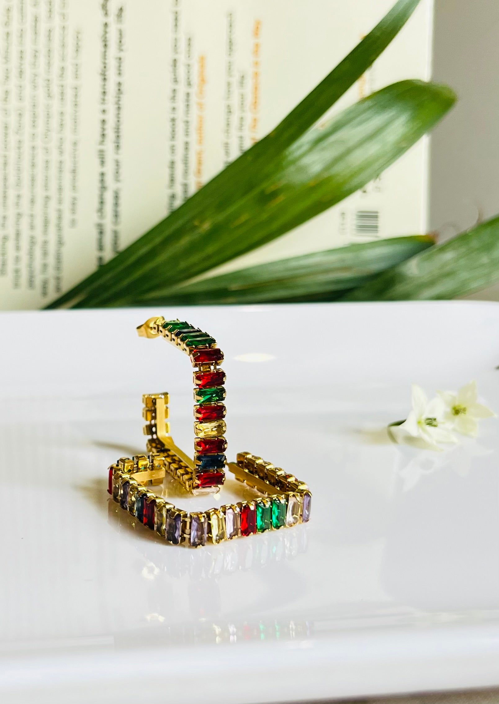 - Material : Metal alloy with gold-tone finish and multicolour baguette rhinestones